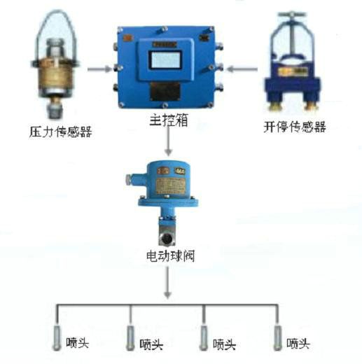 只有水壓傳感器檢測到采煤機(jī)水采水路中有一定的水壓(或工作燈開啟)時,才能允許啟動采煤機(jī)。采煤機(jī)開動后,開停傳感器(或光控傳感器)將信號送入主控箱,主控箱控制電動球閥開啟,實現(xiàn)對產(chǎn)塵點進(jìn)行噴霧降塵。采煤機(jī)停機(jī)(或采煤機(jī)工作燈關(guān)閉)后,主控箱控制電動球閥延時一定的時間后關(guān)閉,停止噴霧降塵。